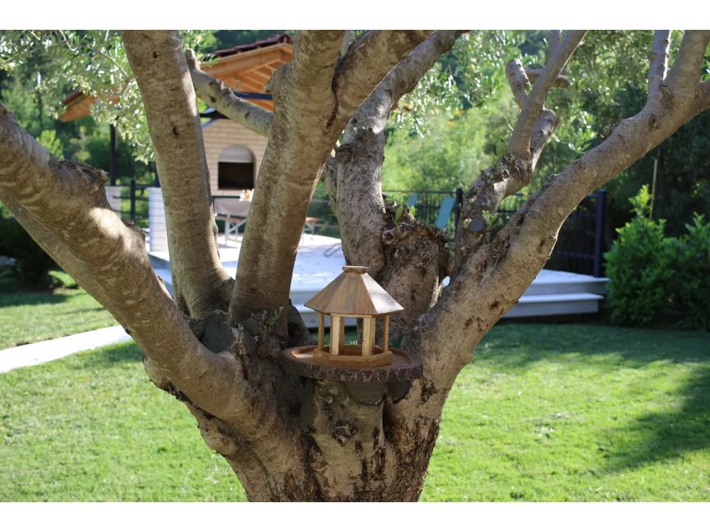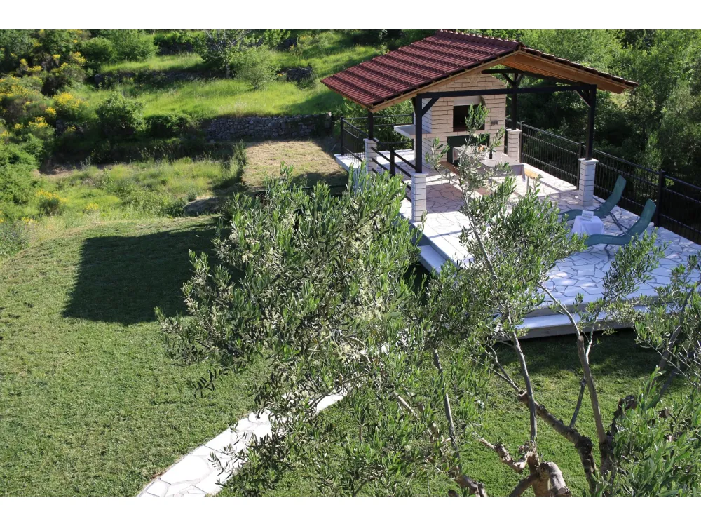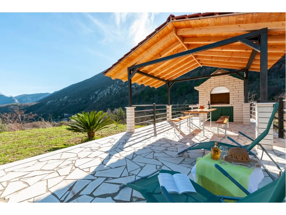The house is located in beautiful nature overlooking the surrounding hills and mountains. It has one bedroom with a double bed, plus two separate rooms with single beds, a bathroom with a shower, a kitchen, and a large living room that has a sofa bed
