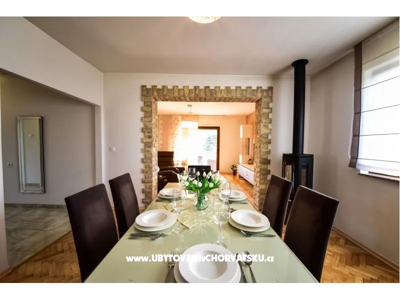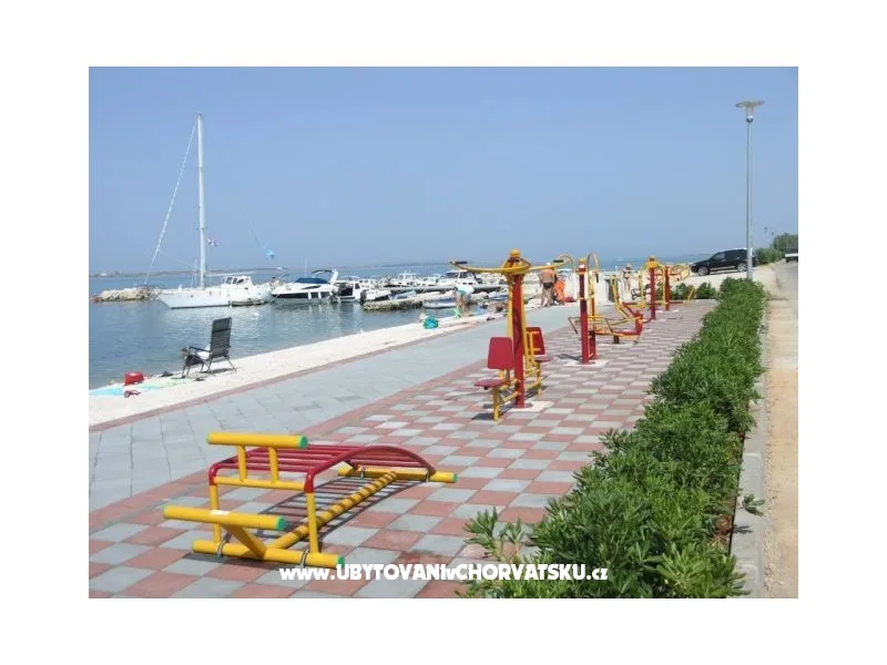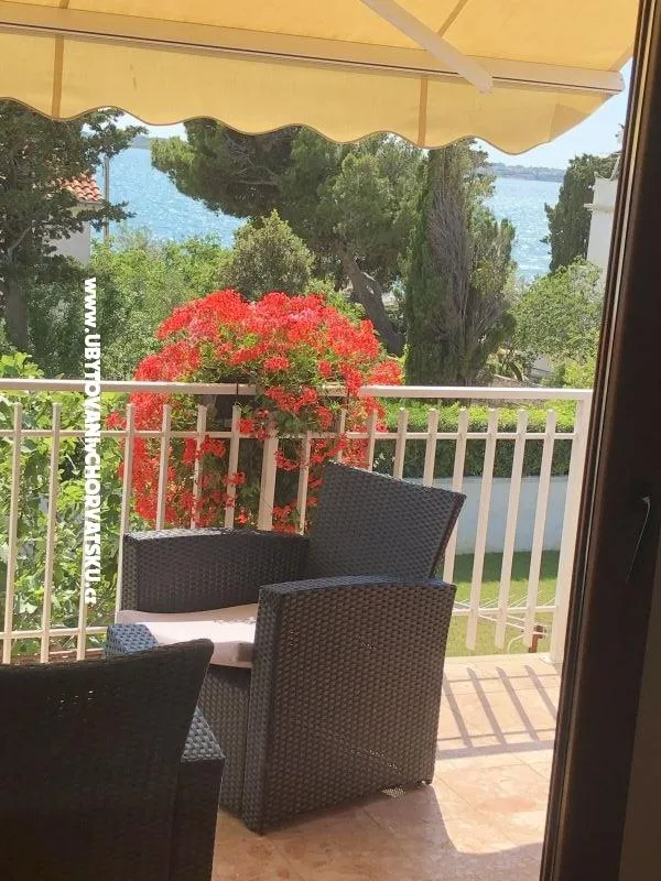 Apartment on the first floor of a family house, 20 m from the beach, air-conditioned. Modernly furnished, with fully equipped kitchen with dishwasher and oven, living room, terrace with sea view. Free WIFI. 2 bedrooms, bathroom with washing machine, separate toilet. Large yard with parking, grill.